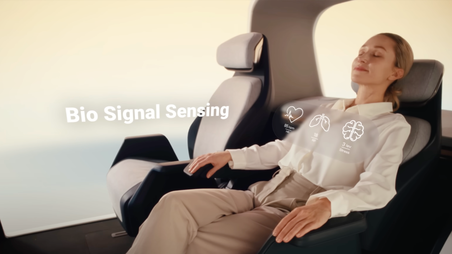 HTVM의 경험은 탑승자가 좌석에 앉는 순간 시작됩니다. 호흡, 심박수, 자세 등의 생체신호를 감지해 몸 상태를 파악하고, 여기에 맞춰 시트 자세나 웰니스 기능을 자동으로 조정합니다. 또한, 탑승객이 원하는 기능에 쉽고 빠르게 접근할 수 있도록 멀티 펑션 스위치로 HMI(Human-Machine Interface) 기술을 구현했습니다.