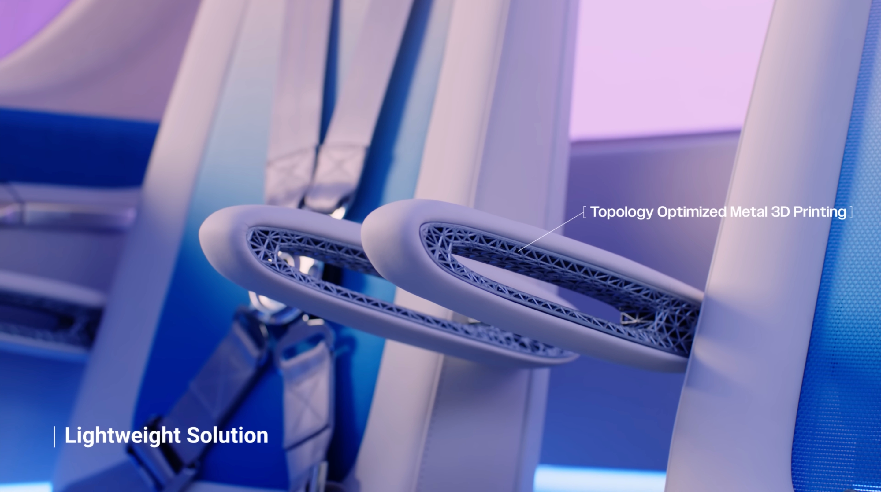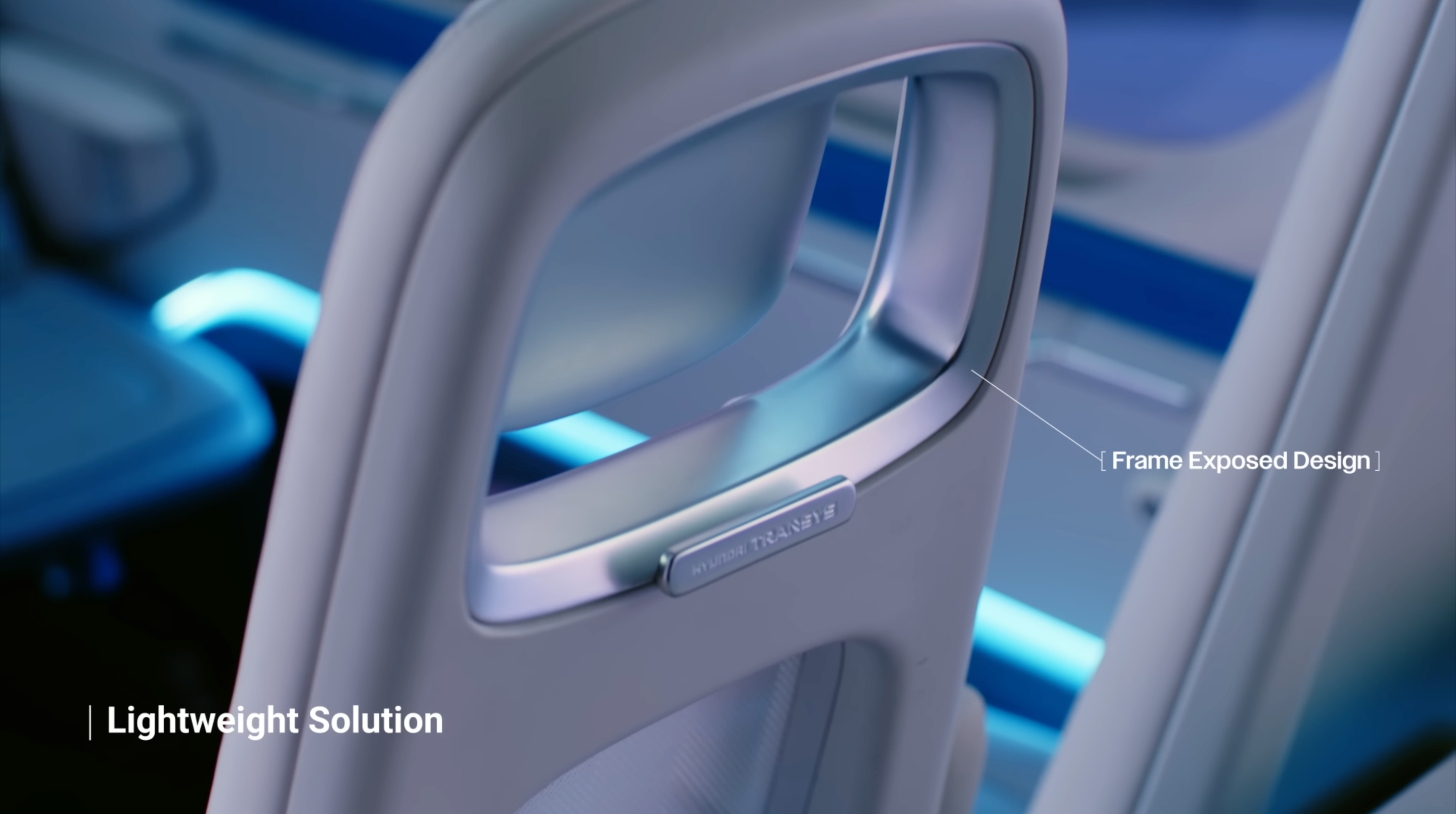 현대트랜시스는 항공 특화 기능성 소재들을 시트에 대거 적용하였습니다. 프레임 노출 디자인과 더불어, 시트 프레임과 팔걸이에는 위상최적화 3D모델링을 활용했고, 시트 백에는 3D 니트 메시를 적용했습니다. 이처럼 다양한 소재와 공법을 통해 UAM에 최적화된 경량화 솔루션을 제시하고 있습니다.