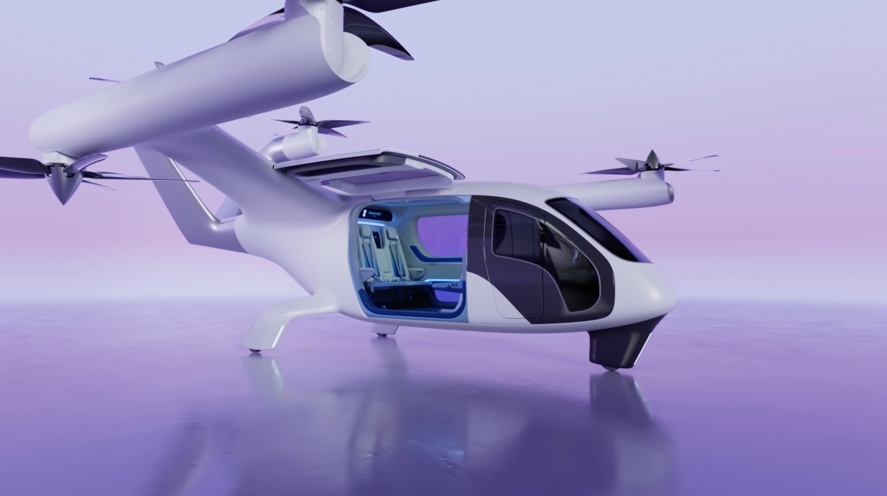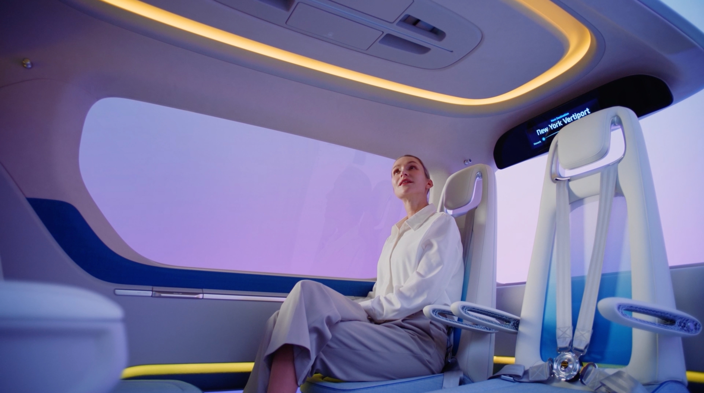 현대트랜시스는 UAM을 이용하는 승객들에게 특별한 이동경험을 제공하기 위해 사람과 교감하는 디자인을 적용했습니다. 이동 중에도 다양한 정보를 제공하는 스마트 글라스, 개인의 취향이나 기분에 따라 다양한 무드를 연출할 수 있는 앰비언트 조명 등 승객의 감성을 충족시키기 위한 세심한 배려와 디테일이 돋보입니다.