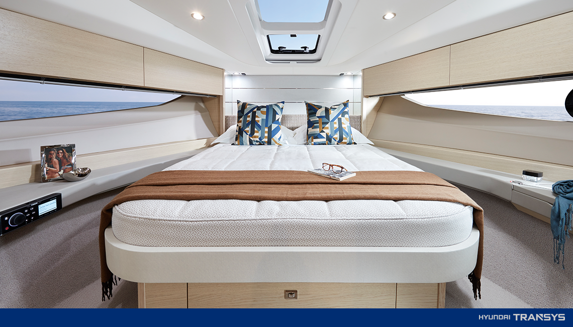 V40은 실내 공간이 넉넉해서 가족 그리고 친구들과 함께 다양한 액티비티를 즐기며 잊을 수 없는 크루징 경험을 할 수 있습니다. 살롱(소파와 테이블이 있는 공간)과 캐빈(객실)에는 햇빛이 온종일 아낌없이 들어오기 때문에 해가 지기 전까지 따뜻한 태양을 즐길 수 있죠. 이 밖에도 선미의 캐빈에는 슬라이딩 침대를 장착할 수 있어서 필요할 때 더블 침대로 쉽게 전환할 수 있습니다.