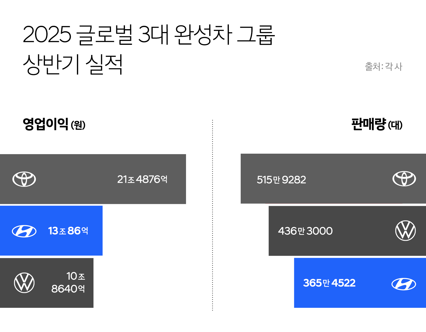 현대차그룹이 올해 상반기 영업이익 13조 원을 기록하며 글로벌 2위에 올랐습니다. 판매량은 도요타, 폭스바겐에 이어 3위였지만, 수익성 측면에서는 폭스바겐을 제치고 2위에 오르는 성과를 거뒀습니다. 현대차그룹이 반기 기준 수익성 측면에서 폭스바겐그룹을 꺾은 건 이번이 처음입니다. 하반기에는 미국 현지에서 하이브리드 차량 생산이 시작돼 관세 부담을 피하면서 수익성이 더욱 개선될 것으로 기대됩니다.