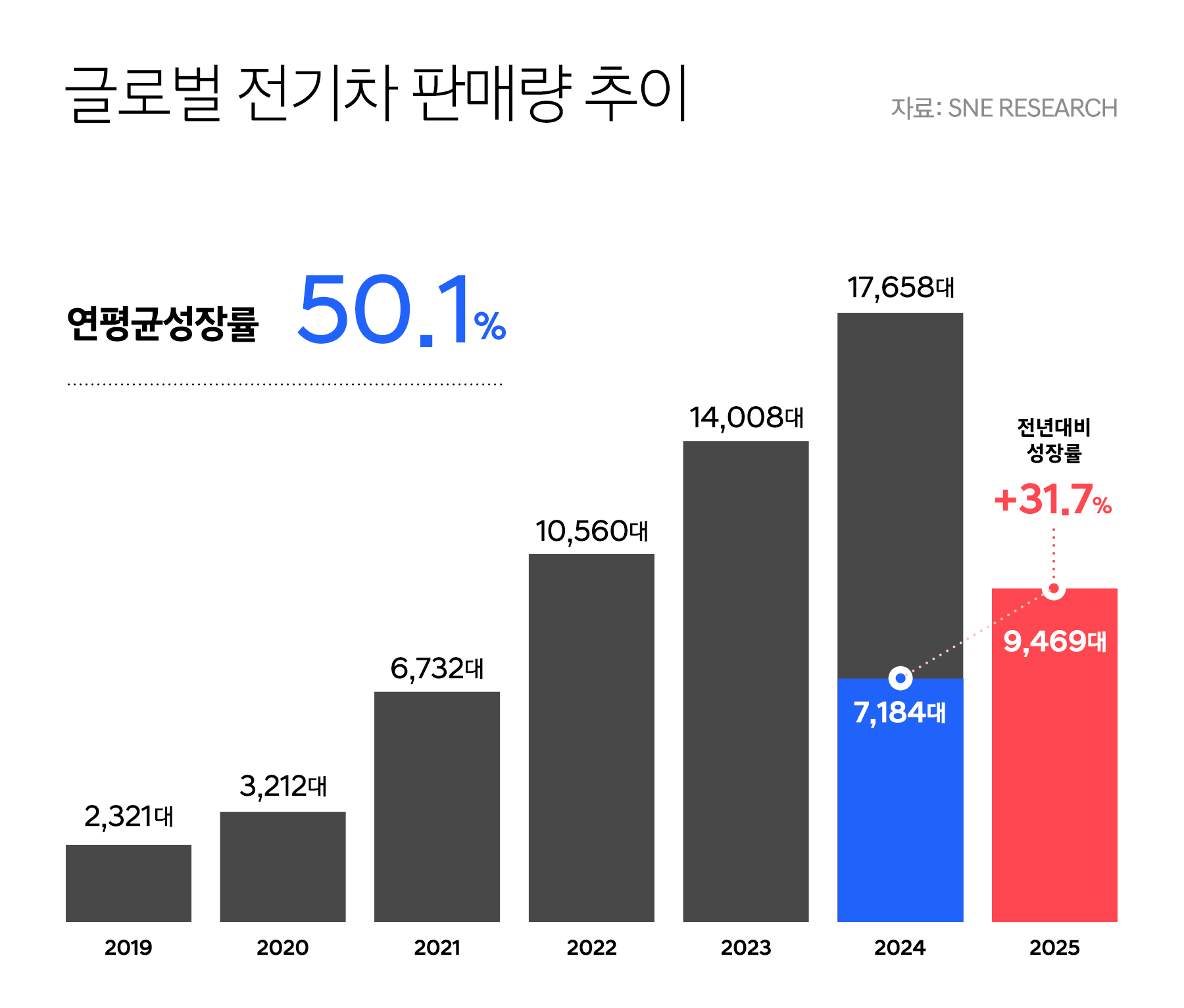 시장조사업체 SNE리서치에 따르면 올해 상반기 글로벌 전기차 판매는 약 947만 대로 지난해 같은 기간보다 31.8% 증가했습니다.
