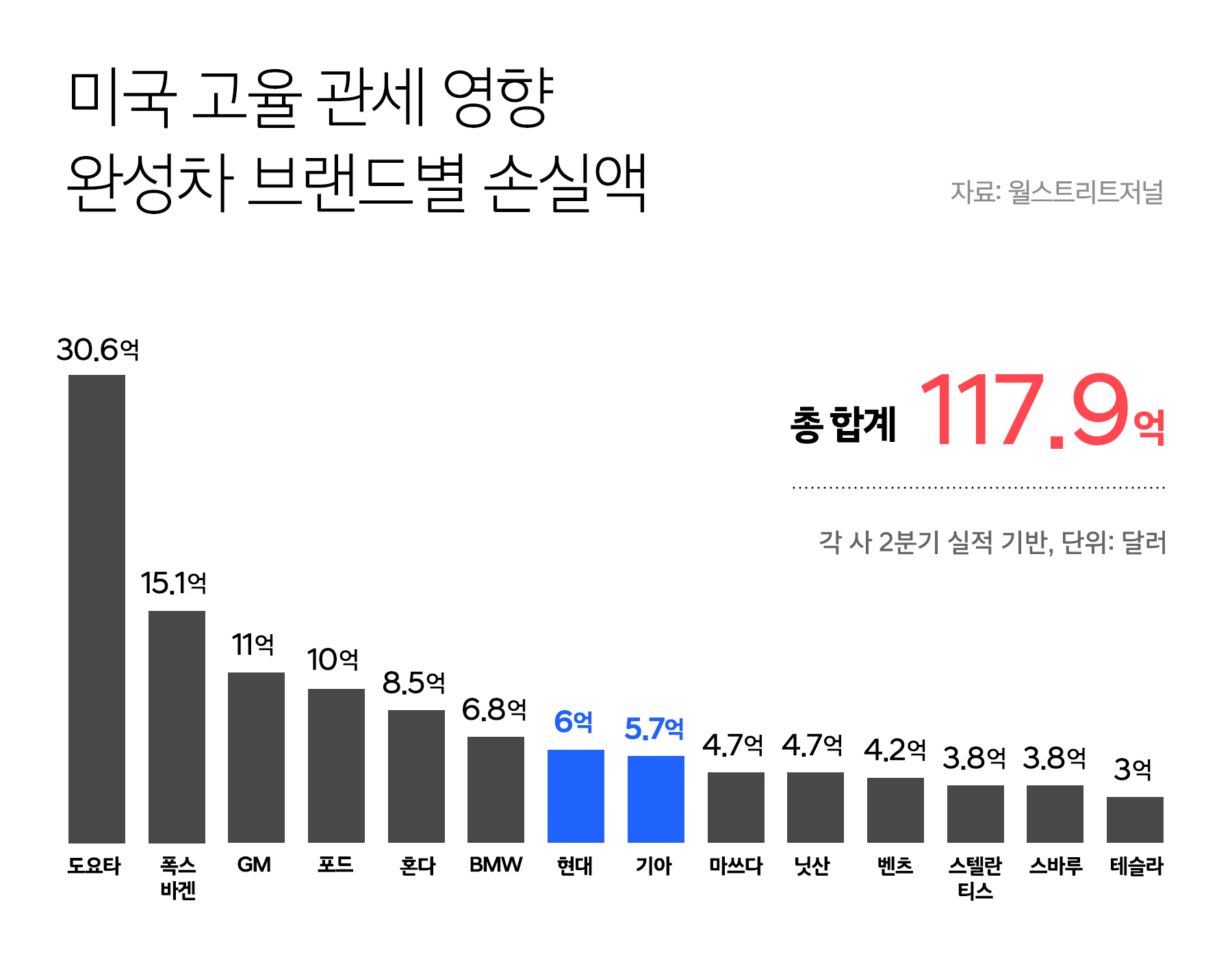 일본 도요타는 관세로만 2분기 영업이익이 30억 달러 줄어 가장 큰 피해를 입었습니다. 폭스바겐(15억 1000만 달러), GM(11억 달러), 포드(10억 달러), 혼다(8억 5000만 달러), BMW(6억 8000만 달러)가 뒤를 이었으며 현대차(6억 600만 달러)와 기아(5억 7000만 달러)는 총 11억 7000만 달러(약 1조 6000억 원)의 손실을 기록했습니다. 마쓰다·닛산도 각각 4억 7000만 달러 수준의 타격을 입었습니다. 일본 주요 완성차 업체 7곳의 연간 영업 손실 규모는 약 25조 원에 이를 것으로 추산되고 있습니다.