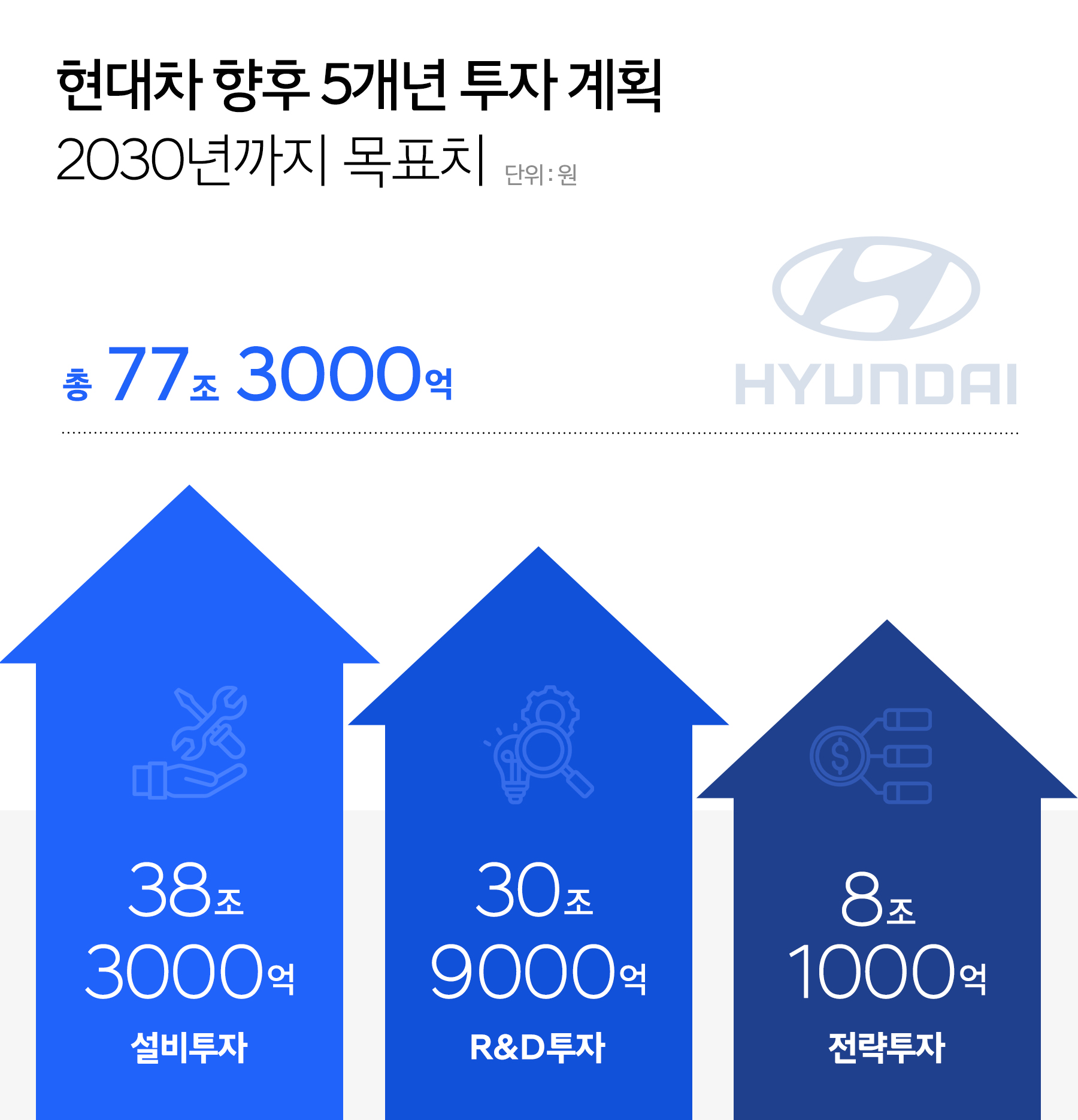 목표한 총 투자 금액 77조 3천억 원에서 설비투자는 38조3천억 원, R&D 투자 30조9천억 원, 전략투자 8조1천억 원입니다. 특히 설비투자는 미국 조지아 메타플랜트, 인도 푸네 공장, 울산 신공장을 3대 ‘혁신 생산기지’로 육성해 연 120만 대 규모의 전기차 생산 역량을 확보하는 데 집중할 계획이라고 밝혔습니다. 메타플랜트는 2030년까지 연 50만 대, 푸네 공장은 25만 대, 울산 신공장은 20만 대 생산을 목표로 가동을 확대할 예정입니다.