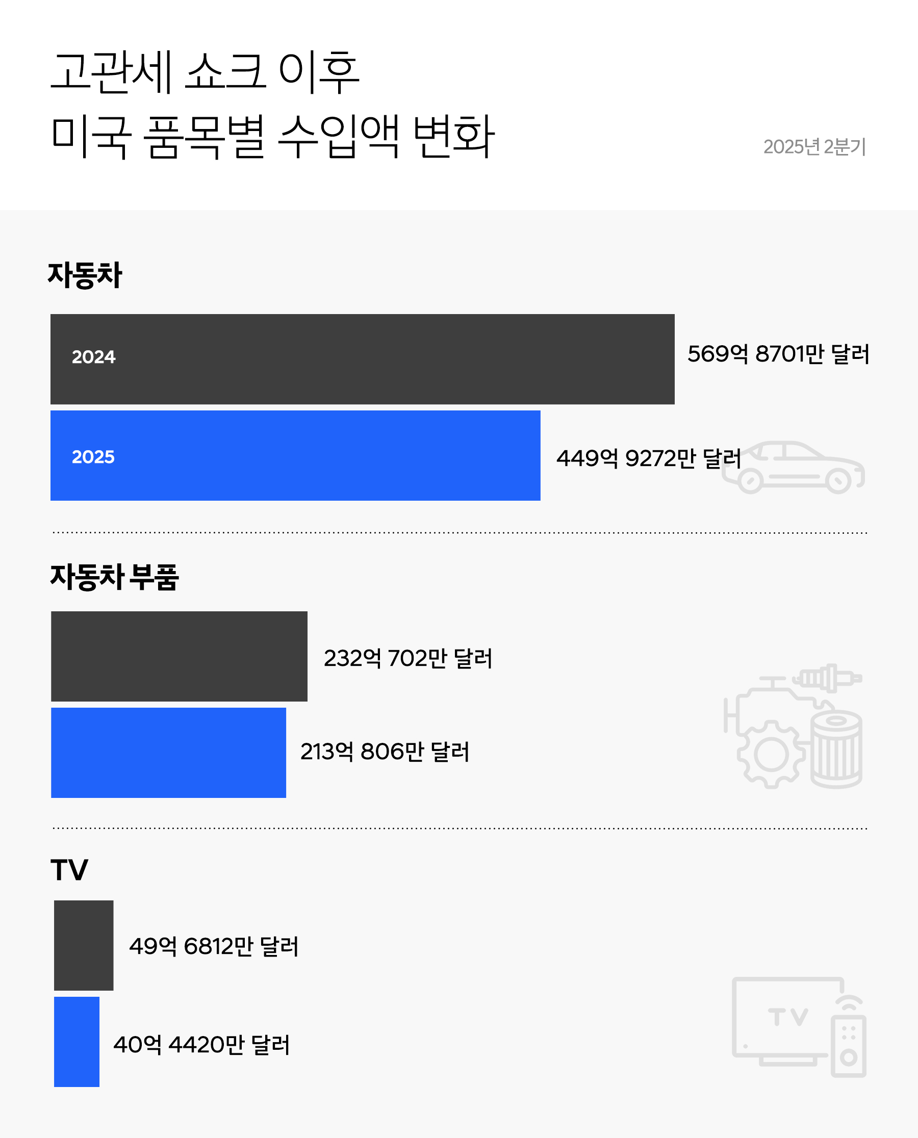관세 여파로 한국의 대미 자동차 수출도 타격을 받고 있습니다. 한국무역협회에 따르면 올 들어 7월까지 대미 자동차 수출액은 전년 동기 대비 15.1% 감소한 182억달러(약 25조4891억원)로 집계됐습니다. 자동차 부품업계도 생존을 걱정해야 하는 상황으로 내몰렸습니다. 완성차 수출이 타격받아 국내 생산량이 감소하면 차 부품·소재 협력사도 그만큼 힘들어지게 됩니다. 국내 자동차 부품업계의 대미 수출액은 지난해 82억2200만달러(약 12조원)에 달했습니다.