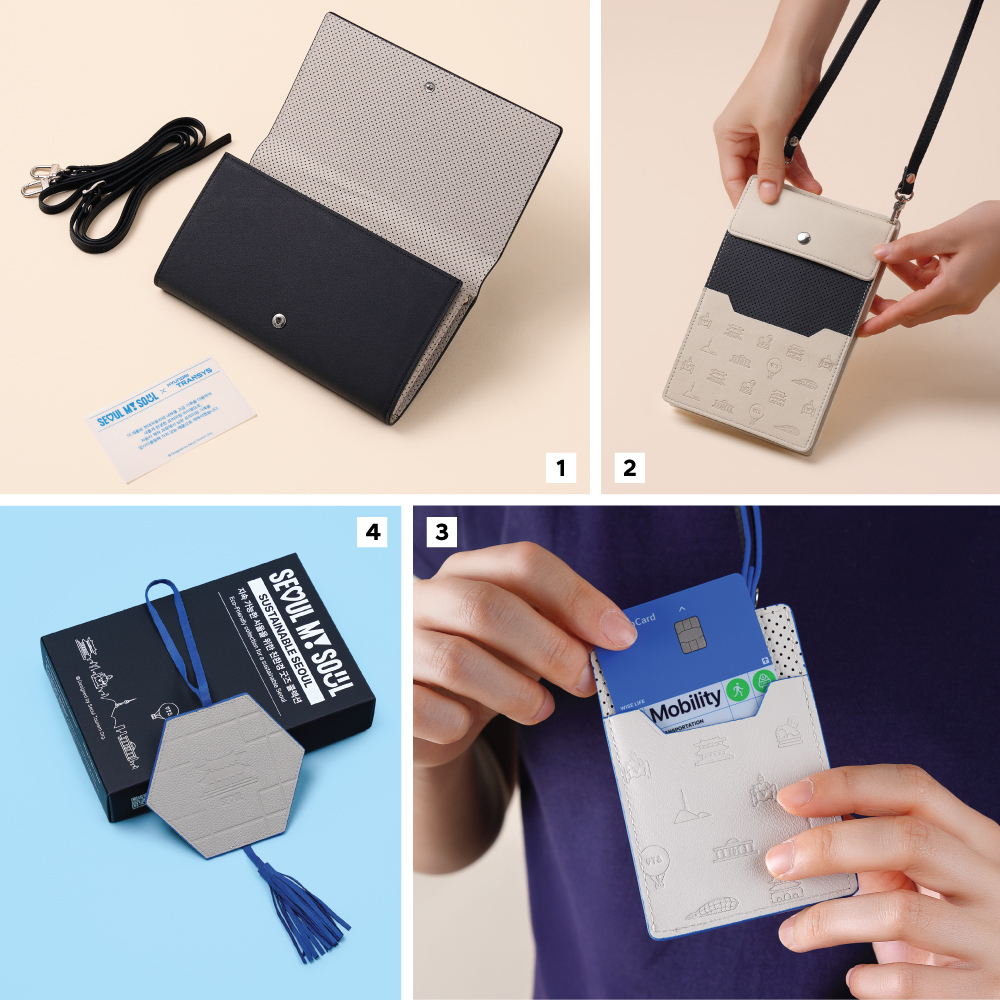 현대트랜시스는 서울관광재단과 함께 카드지갑, 샤코슈백, 아코디언백, 러기지네임택 2종 등 총 5개의 시트 가죽 업사이클링 제품을 개발했습니다. 남산, 경복궁, 해치 등 서울의 다양한 랜드마크와 상징물을 디자인 패턴으로 적용하여 서울을 찾은 방문객들에게 뜻깊은 추억을 선사할 뿐만 아니라, 버려진 자원을 재활용하여 일상 속에서도 친환경 가치를 실천할 수 있는 제품입니다.