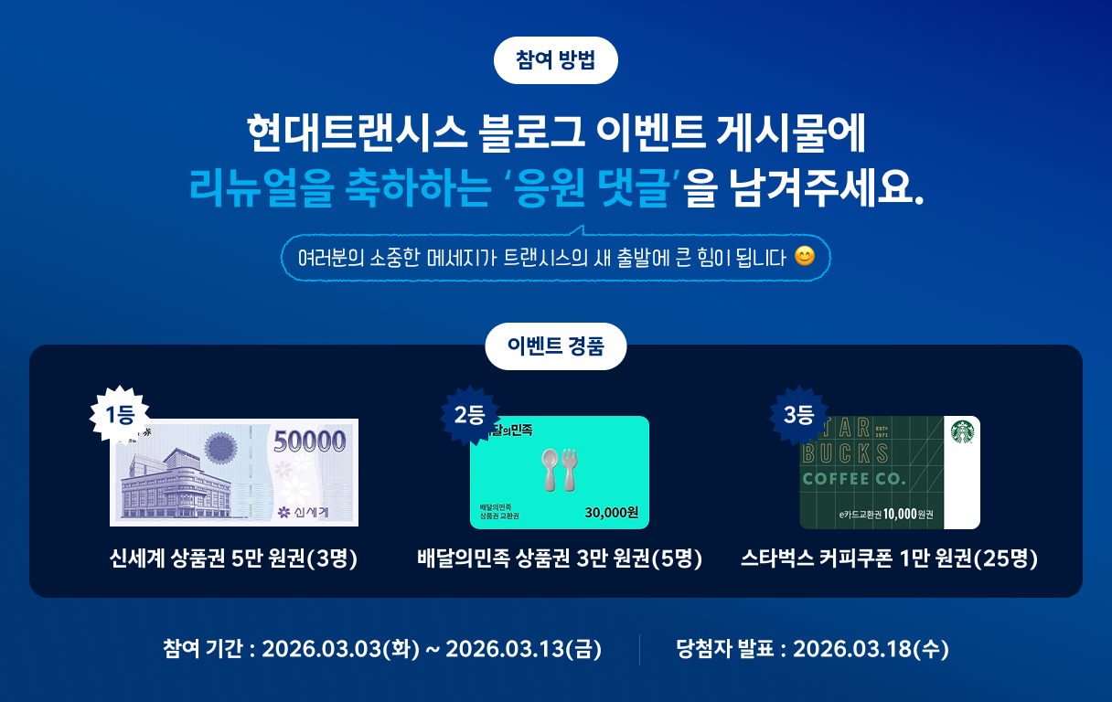 | 현대트랜시스 블로그 리뉴얼 EVENT!💌 당첨자 발표 (0) | 2026.03.18 |
