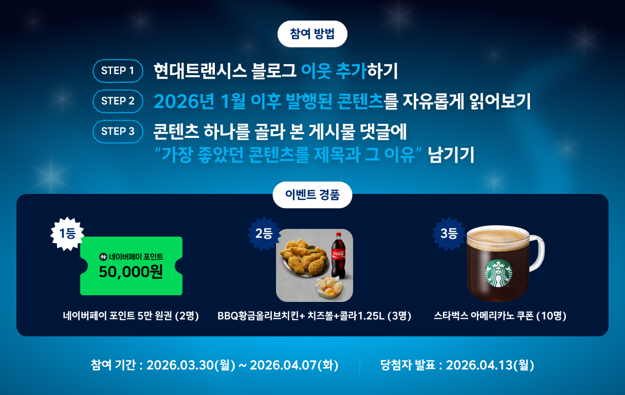 | 현대트랜시스 블로그 리뉴얼 EVENT!💌 당첨자 발표 (0) | 2026.03.18 |