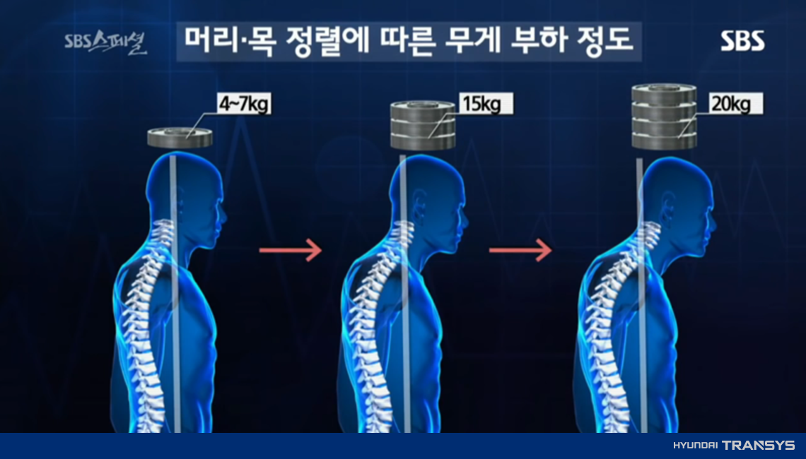 건강보험공단의 조사에 따르면, 최근 5년간 ‘목 디스크(M50)’ 환자수는 2014년 87만명에서 2018년 96만명으로 `14년대비 10%(연평균 2.4%) 증가 한 것으로 나타났습니다. 연령대별 진료비 통계자료를 보면, 30대 9.7%, 40대 19.7%, 50대 29.6%로 나이대가 올라갈수록 비율이 높아지는 것을 볼 수 있는데요. 현대트랜시스 임직원의 절대 다수가 30~50대이기에, 우리도 더욱 신경을 써야 할 부분입니다.
