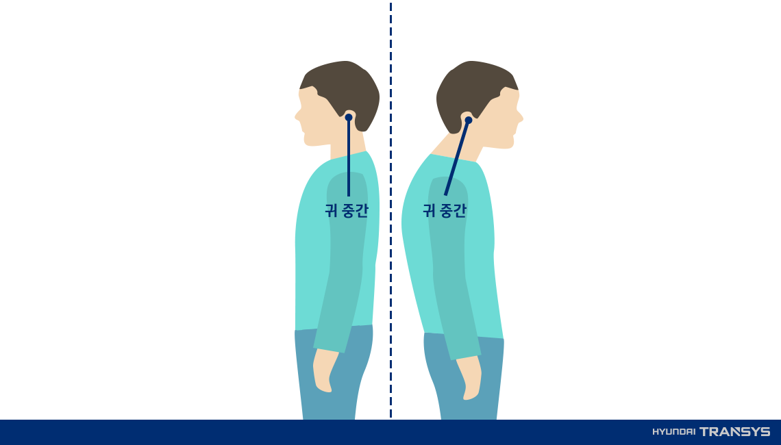 프로페셔널한 직장인은 건강 관리도 프로페셔널하게! 오늘도 열심히 모니터를 바라보며 일하고 있을 직장인을 위해 거북목 자가진단 방법과 예방법에 관해 이야기해보겠습니다. 정면을 바라보고 똑바로 선 자세에서 귀 중간부터 어깨 쪽 아래로 가상의 선을 그려보세요. 정상적인 목이라면 선이 귀 중간에서부터 수직으로 떨어집니다. 한편 선이 귀 중간보다 앞으로 한참 나와 있거나, 등이 굽어진 상태라면 거북목을 의심해 보셔야 합니다.