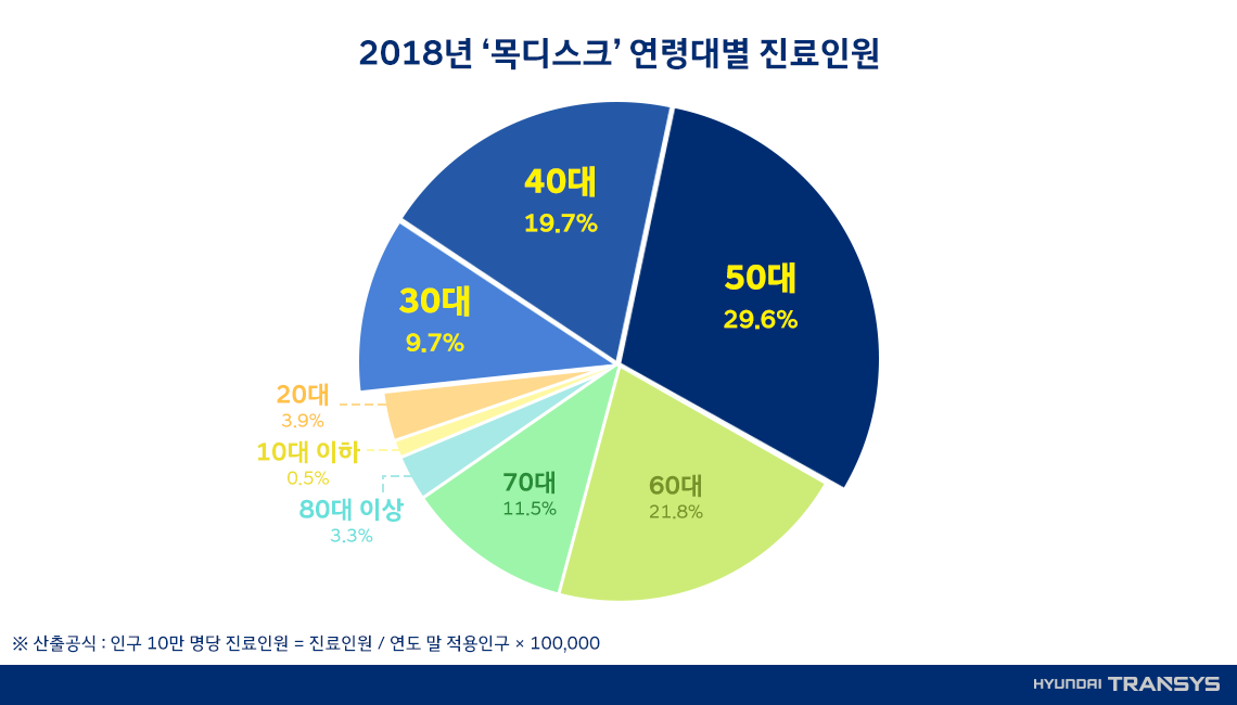 건강보험공단의 조사에 따르면, 최근 5년간 ‘목 디스크(M50)’ 환자수는 2014년 87만명에서 2018년 96만명으로 `14년대비 10%(연평균 2.4%) 증가 한 것으로 나타났습니다. 연령대별 진료비 통계자료를 보면, 30대 9.7%, 40대 19.7%, 50대 29.6%로 나이대가 올라갈수록 비율이 높아지는 것을 볼 수 있는데요. 현대트랜시스 임직원의 절대 다수가 30~50대이기에, 우리도 더욱 신경을 써야 할 부분입니다.