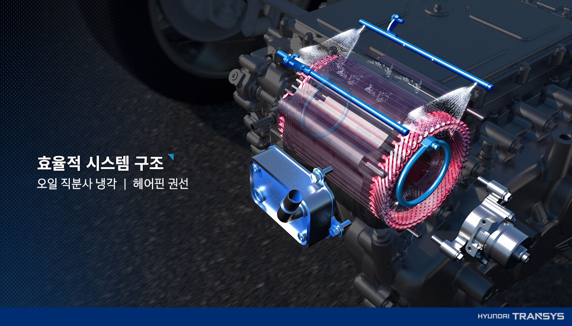 EV구동시스템인 전기차에서는 내연기관의 엔진과 변속기, 연료탱크 등의 주요 구동계의 역할을 모터와 감속기, 배터리가 담당합니다. 엔진이 작은 전기 모터로 변경되고, 연료 탱크 대신 배터리가 차량 바닥에 탑재되면서 변속기의 기능을 감속기가 대신하게 됩니다. 현대트랜시스의 모터와 인버터, 감속기를 결합한 3-in-1 EV 구동시스템은 크기가 작고 원가 경쟁력이 높습니다. 이는 소비자에게 전기차 가격에 대한 부담을 낮추고 차체 설계도 더욱 자유롭게 할 수 있는 장점이 있습니다. 특히 3-in-1 EV 구동시스템은 오일 직분사 방식 등 냉각효율을 극대화한 것 또한 특징입니다.