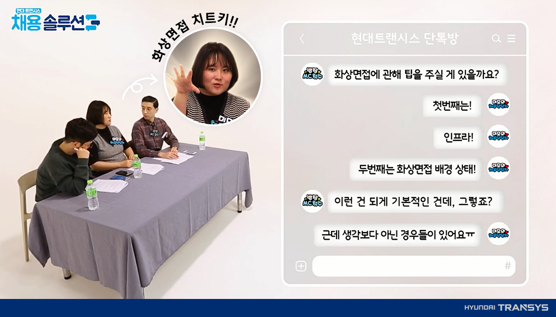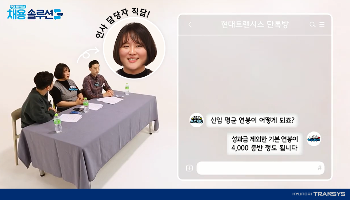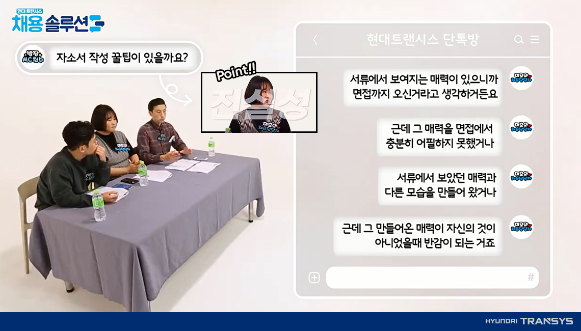 현대트랜시스 채용 담당자 그리고 MC철수팀이 한자리에 모인 이유는? 바로! 현대트랜시스 채용 꿀팁을 알려 드리기 위해서인데요. 사전에 ‘현대트랜시스’ 관련한 궁금증을 수집하여 실제 취준생들이 물어본 질문만 쏙 쏙 뽑아 준비했습니다.
