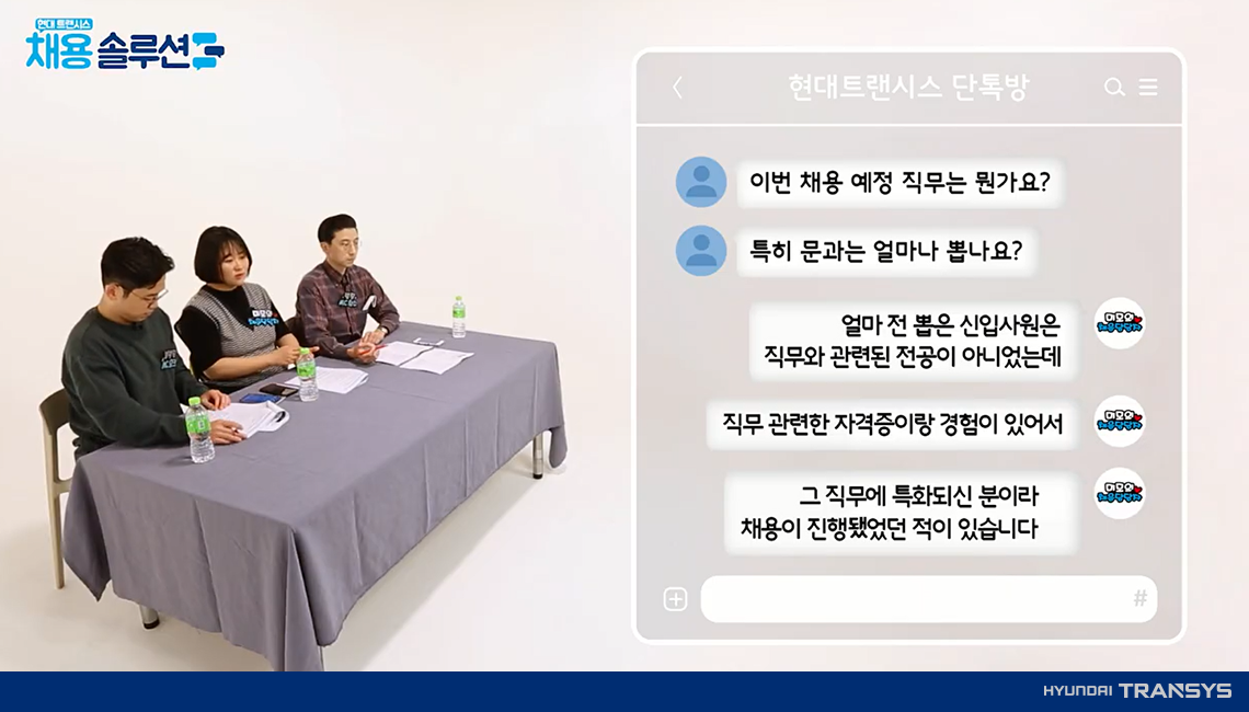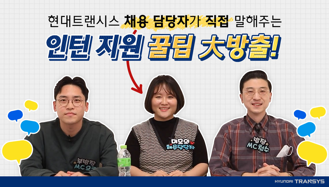 현대트랜시스 채용 담당자 그리고 MC철수팀이 한자리에 모인 이유는? 바로! 현대트랜시스 채용 꿀팁을 알려 드리기 위해서인데요. 사전에 ‘현대트랜시스’ 관련한 궁금증을 수집하여 실제 취준생들이 물어본 질문만 쏙 쏙 뽑아 준비했습니다.