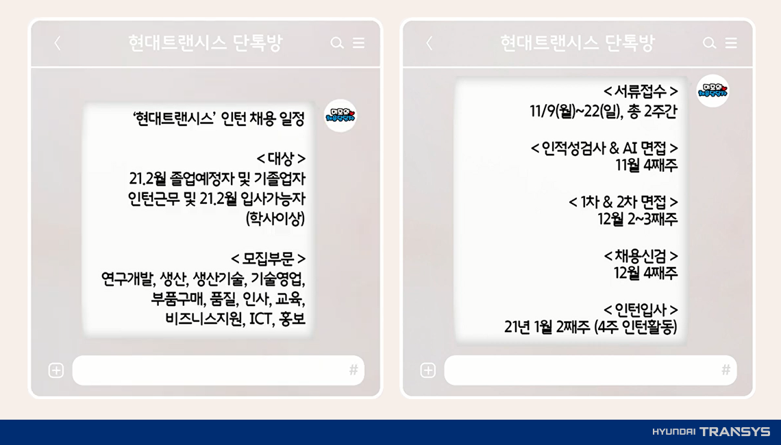 이보다 더 솔직할 수는 없다! 채용담당자의 솔직한 답변은 물론 현대트랜시스 출범 이래 첫 대규모 인턴 채용 소식까지! 어디서도 볼 수 없었던 현대트랜시스 채용 솔루션, 꿀팁 대방출 영상 속 질문과 답변 몇 가지를 미리 살펴보겠습니다.