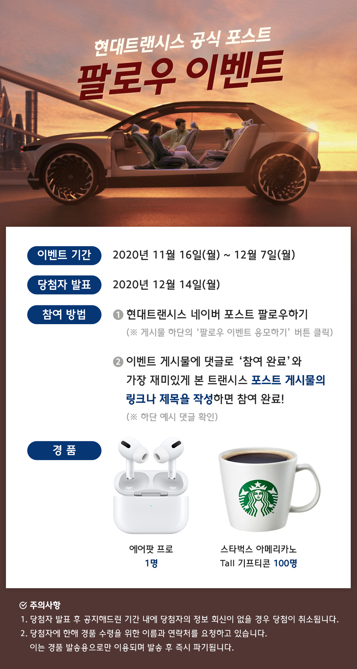 2020년도 어느덧 막바지를 향해 달려가고 있습니다. 남은 2020년도 현대트랜시스와 함께 유익한 시간 보내시길 바라며 <현대트랜시스 네이버 공식 포스트 팔로우 이벤트>를 준비했습니다.